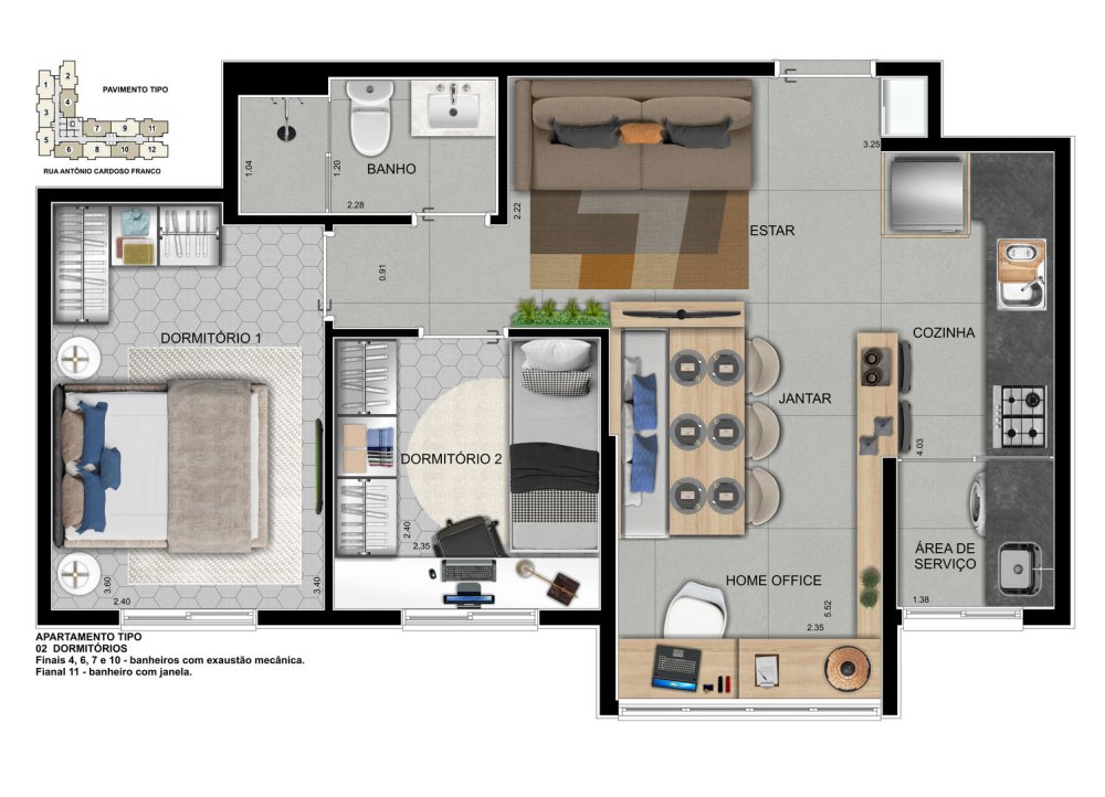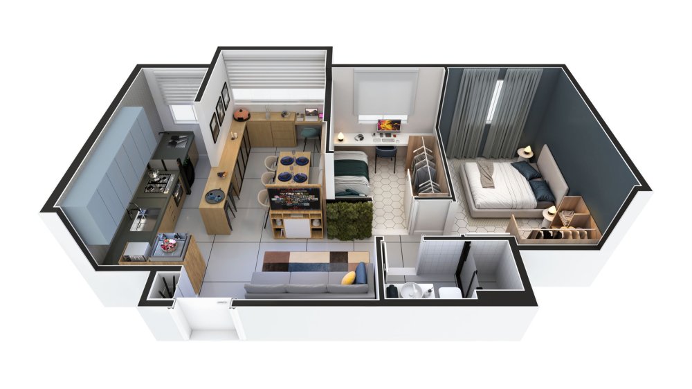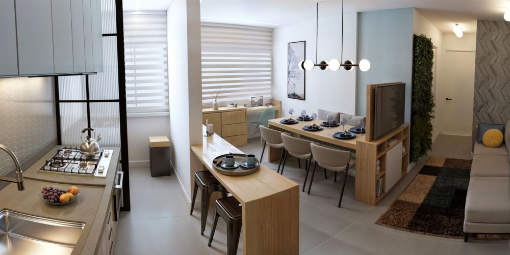 * Layout Inteligente: 2 dormitórios, 1 banheiro e 2 salas, projetados para o máximo de aproveitamento do espaço e conforto.