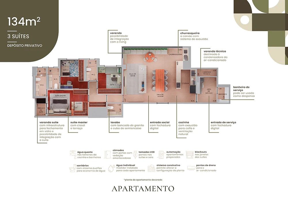 A sacada com churrasqueira convida a momentos de descontração com amigos e familiares, enquanto as 3 vagas de garagem garantem a comodidade que você merece. O empreendimento oferece uma infraestrutura completa de lazer e bem-estar: