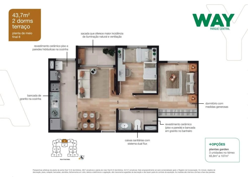 Com um total de 191 unidades distribuídas em 14 andares, este condomínio se destaca pela sua infraestrutura completa e design inteligente. Cada apartamento possui uma área privativa de 45.43m², perfeitamente distribuídos em 2 dormitórios aconchegantes, 1 banheiro moderno, 2 salas espaçosas e 1 vaga de garagem.