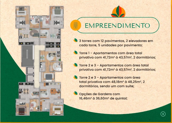 Torre 02 e 03 - Apartamentos área total privativa com 48,18 m² à 48,25 m² 02 domitórios , sendo uma suite
